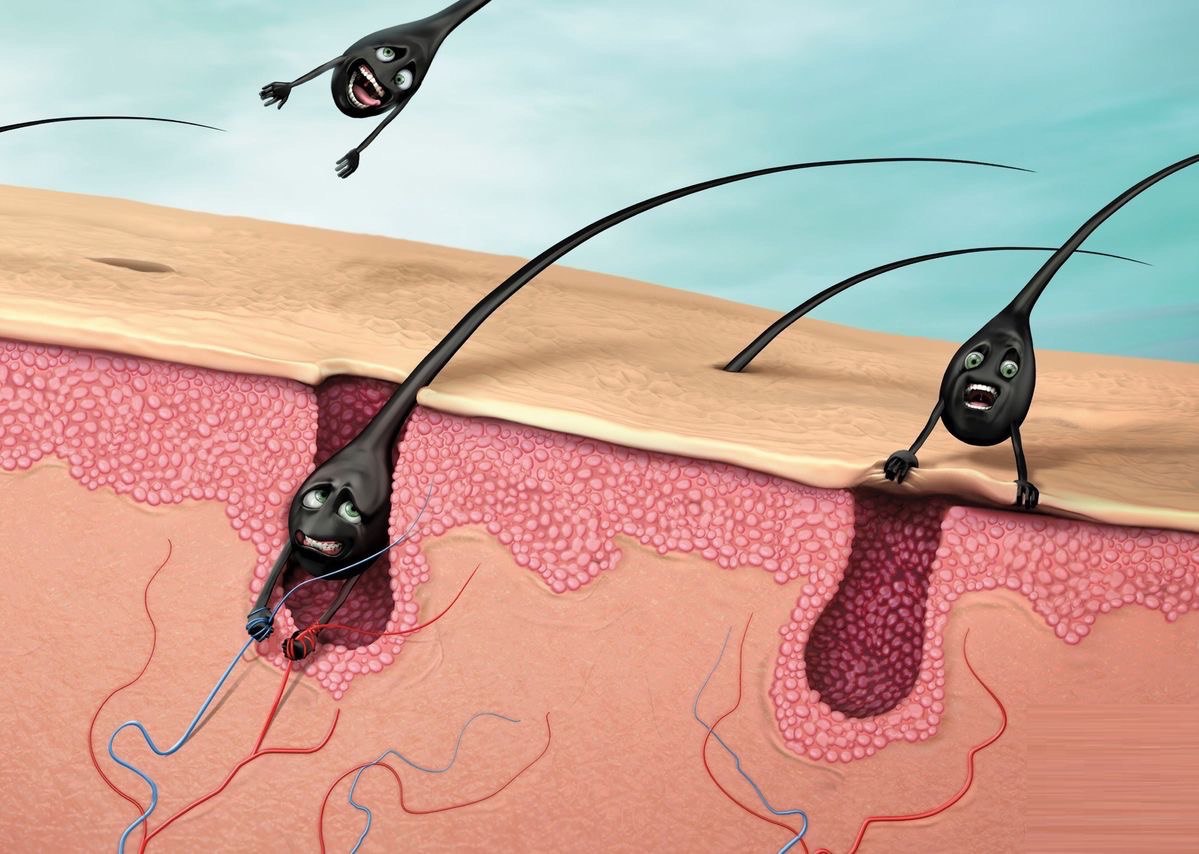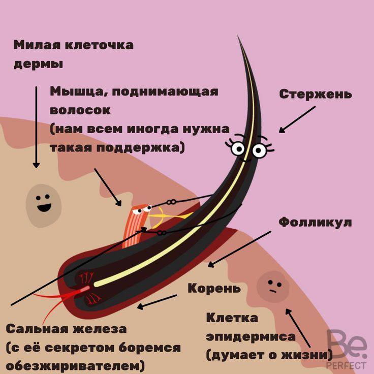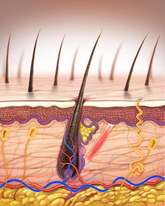 Дело в том, что каждый волос состоит из двух частей: видимой части — стержня волоса и скрытого в коже фолликула. Живые клетки, которые размножаются с огромной скоростью, находятся в волосяном фолликуле, залегающем глубоко в дерме.